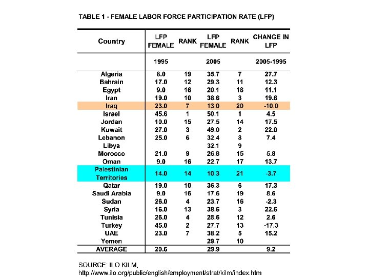 Iraq • Micro level labor force data unavailable • LFP rate stagnated in 1980 s and 1990 s • anthropological studies – Cainkar (1993) and Al Ali (1995) • Educated women exited labor market due to declining wages/benefits • Less educated women may have been driven into market due to economic hardship