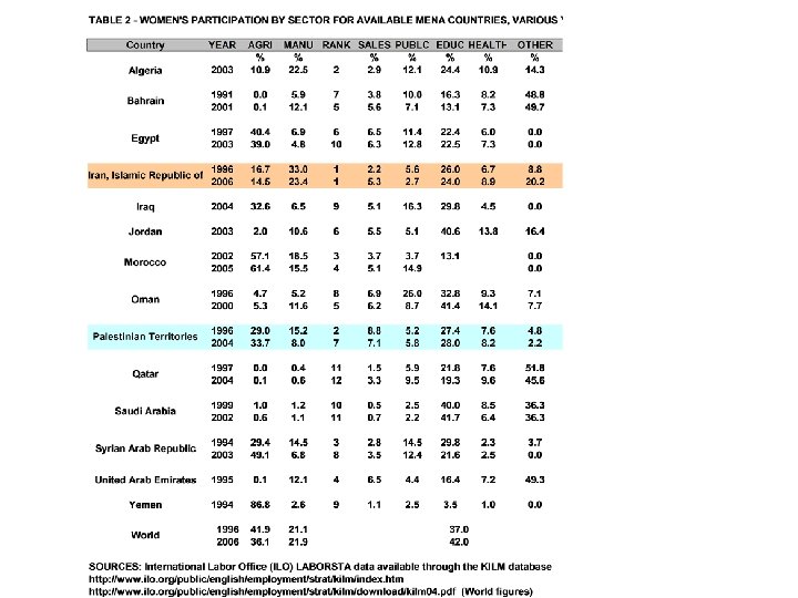 Detailed conclusions • Experiences of Iran and Palestine similar – Reduced trade/reduced manufacturing/decline in female LFP – Class implication = less educated women losing out – Evidence of defeminization of certain sectors • Palestine – – growing government sector primarily benefitted educated women – Poor women returned to subsistence agriculture sector • Iran – – public sector shrinking and – informal sector growing • Iraq – – Trends unclear – different pattern may have emerged due to different (less industrial) economic structure