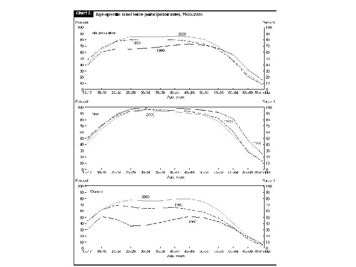 Gender and Work n Labor force participation rate of women has increased from 43. 4% in 1971 to 60. 2% in 2000 q Men’s rate has decreased from 79. 1% to 74. 7% q q q White men’s LFPR in 2000: 75. 4% White women: 59. 8 Black men: 69. 0 Black women: 63. 2 Hispanic men: 80. 6 Hispanic women: 56. 9 § Source: U. S. Bureau of Labor Statistics