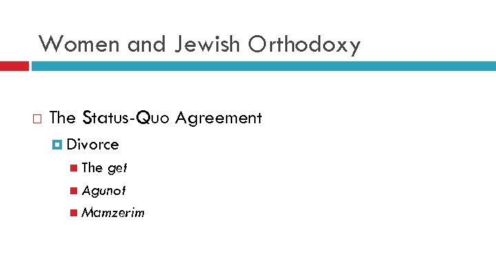 Women and Jewish Orthodoxy The Status-Quo Agreement “A compromise between socialist men and Orthodox men, at the expense of women” - Swirski and Safir, 1993 Religious court system women not judged by peers