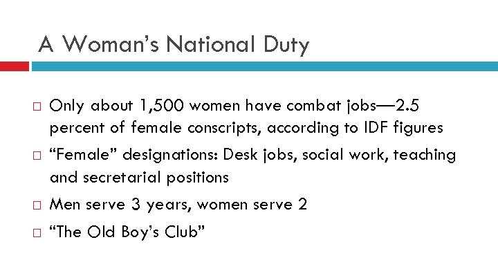 A Woman’s National Duty Only about 1, 500 women have combat jobs— 2. 5 percent of female conscripts, according to IDF figures “Female” designations: Desk jobs, social work, teaching and secretarial positions Men serve 3 years, women serve 2 “The Old Boy’s Club”