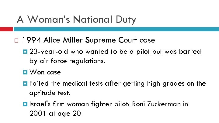 A Woman’s National Duty 1994 Alice Miller Supreme Court case 23 -year-old who wanted to be a pilot but was barred by air force regulations. Won case Failed the medical tests after getting high grades on the aptitude test. Israel's first woman fighter pilot: Roni Zuckerman in 2001 at age 20