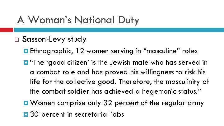 A Woman’s National Duty Sasson-Levy study Ethnographic, 12 women serving in “masculine” roles “The ‘good citizen’ is the Jewish male who has served in a combat role and has proved his willingness to risk his life for the collective good. Therefore, the masculinity of the combat soldier has achieved a hegemonic status. ” Women comprise only 32 percent of the regular army 30 percent in secretarial jobs