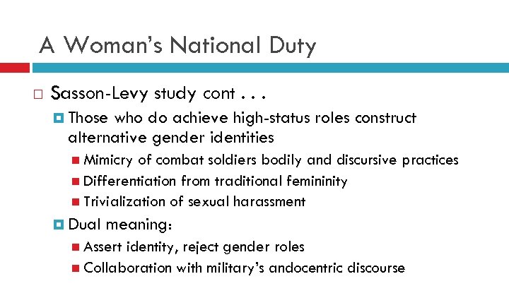A Woman’s National Duty Sasson-Levy study cont. . . Those who do achieve high-status roles construct alternative gender identities Mimicry of combat soldiers bodily and discursive practices Differentiation from traditional femininity Trivialization of sexual harassment Dual meaning: Assert identity, reject gender roles Collaboration with military’s andocentric discourse