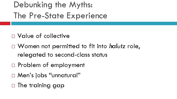 Debunking the Myths: The Pre-State Experience Value of collective Women not permitted to fit into halutz role, relegated to second-class status Problem of employment Men’s jobs “unnatural” The training gap