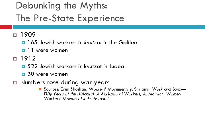 Debunking the Myths: The Pre-State Experience 1909 1912 165 Jewish workers in kvutzot in the Galilee 11 were women 522 Jewish workers in kvutzot in Judea 30 were women Numbers rose during war years Sources: Even Shoshan, Workers’ Movement; y. Shapira, Work and Land— Fifty Years of the Histadrut of Agricultural Workers; A. Maimon, Women Workers’ Movement in Eretz Israel