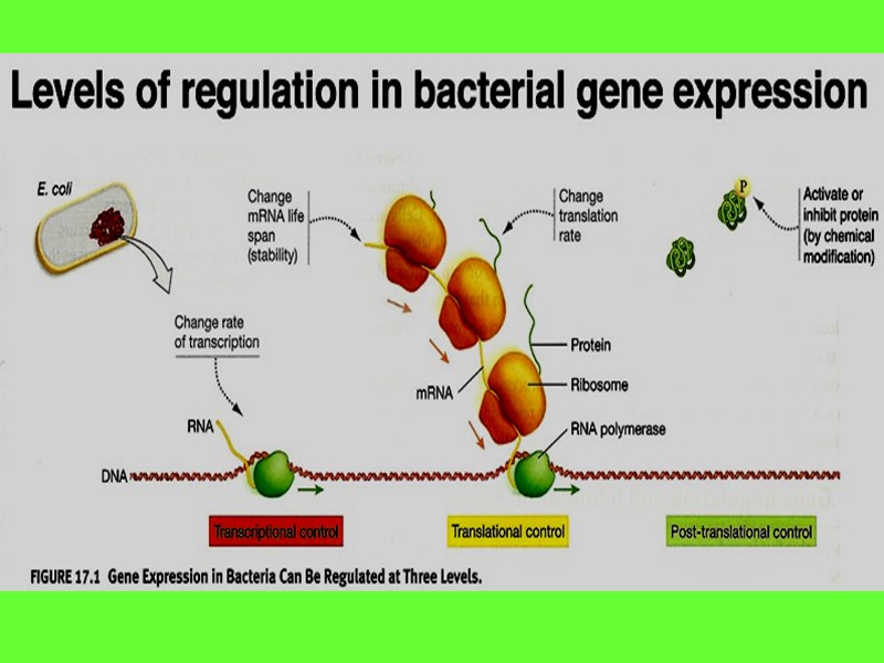 All the levels may be regulated: Transcription Processing Translation AAAAAAA Genes of DNA Primary transcript m-RNA Polypeptide chain Modification Substrate A Product B Function Active protein Gm3 Intron Exon