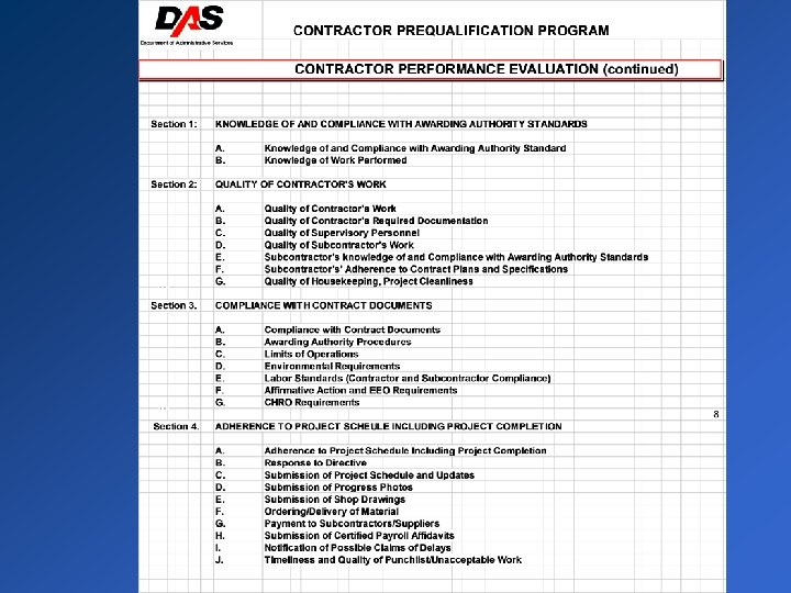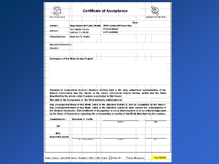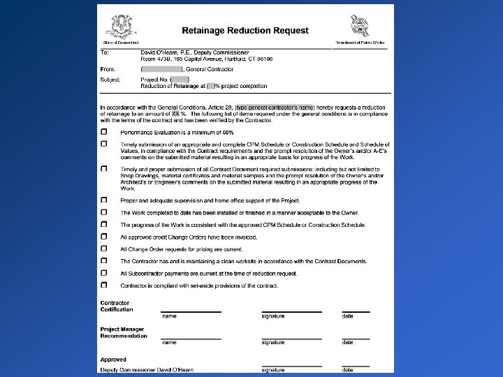 ARTICLE 28 PARTIAL PAYMENTS n 28. 2 Continued…. n n 28. 2. 2 Subsequent to Substantial Completion, in limited circumstances, at the sole discretion of the Commissioner, a reduction of Retainage below Two and one-half percent (2. 5%) may be considered. 28. 2. 3 A “Good” Contractor’s Performance Evaluation score shall be defined as a minimum total score of sixty percent (60%).