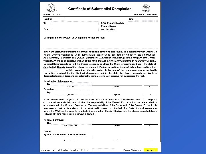 ARTICLE 30 SUBSTANTIAL COMPLETION AND ACCEPTANCE n 30. 1 Substantial Completion Continued…. . n n 30. 1. 4 The Certificate of Substantial Completion shall be signed by the Construction Administrator, Owner, and Architect or Engineer. Upon Substantial Completion of the Work or designated portion thereof and upon application by the Contractor and certification by the Construction Administrator and Architect or Engineer, the Owner shall make payment reflecting adjustment in Retainage, if any, for such Work or portion thereof as provided in the Contract Documents. 30. 2 Acceptance: 30. 2. 1 Upon completion of the Work, the Contractor shall forward to the Construction Administrator a written notice that the Work is ready for inspection and Acceptance. 30. 2. 2 When the Work has been completed in accordance with terms and conditions of the Contract Document a Certificate of Acceptance shall be issued by the Owner.