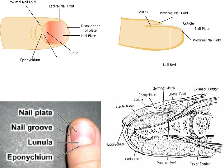 Structure of a Nail • Scalelike modification of the epidermis on the distal, dorsal surface of fingers and toes • Consist of stratified squamous epithelial cells overlying the nail bed, with the lunula as the most actively growing region of the nail root • As new cells are produced, older ones are pushed outward and become keratinized.