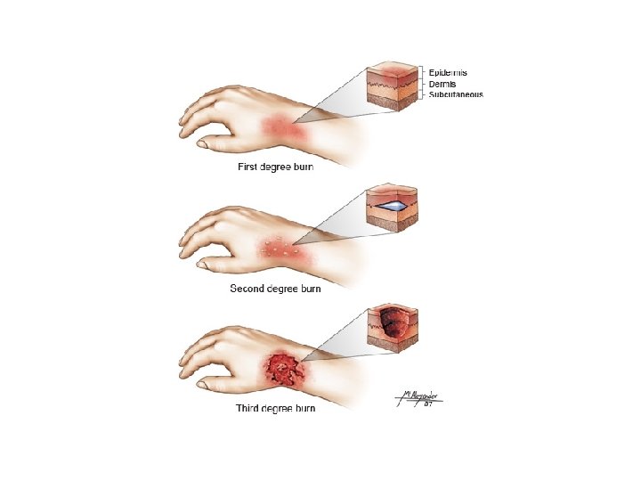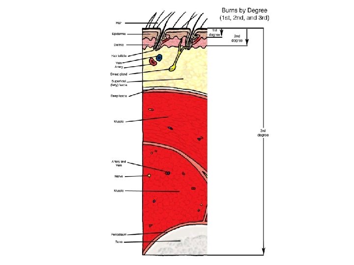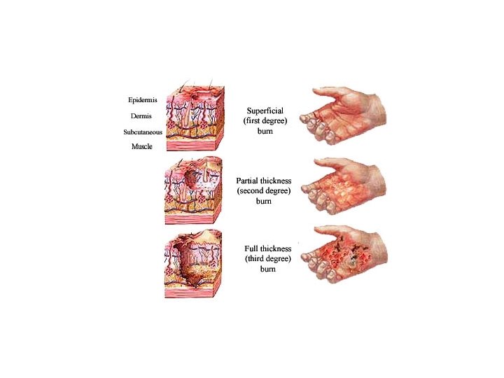 Burns • First-degree – only the epidermis is damaged – Symptoms include localized redness, swelling, and pain • Second-degree – epidermis and upper regions of dermis are damaged – Symptoms mimic first degree burns, but blisters also appear • Third-degree – entire thickness of the skin is damaged – Burned area appears gray-white, cherry red, or black; there is no initial edema or pain (since nerve endings are destroyed)