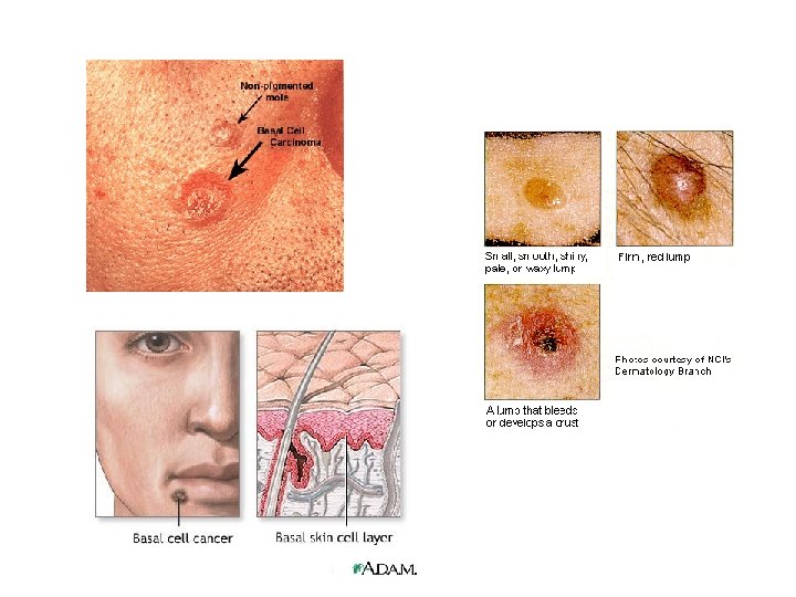 Basal Cell Carcinoma • Least malignant and most common skin cancer • Stratum basale cells proliferate and invade the dermis and hypodermis • Slow growing and do not often metastasize • Can be cured by surgical excision in 99% of the cases