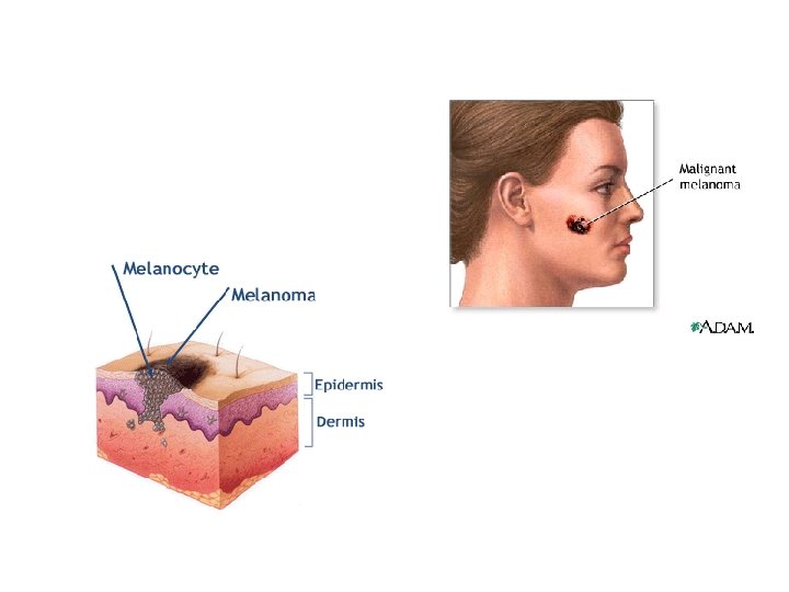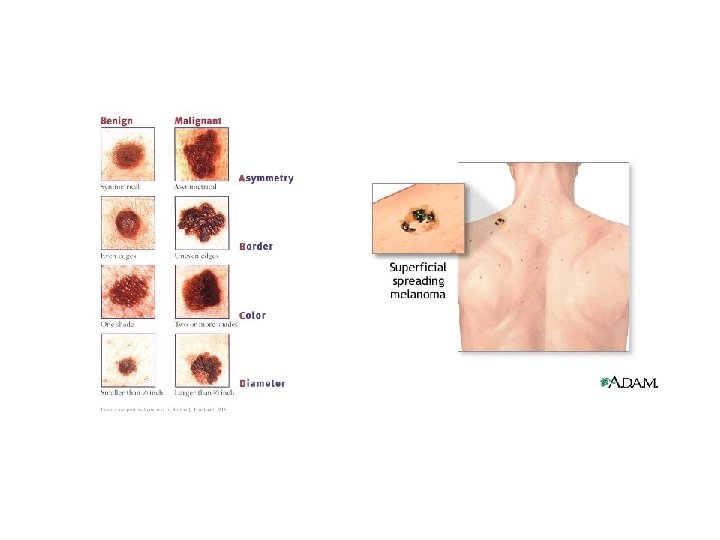 Melanoma (cont. ) • Melanomas have the following characteristics (ABCD rule) – A: Asymmetry; the two sides of the pigmented area do not match – B: Border is irregular and exhibits indentations – C: Color (pigmented area) is black, brown, tan, and sometimes red or blue – D: Diameter is larger than 6 mm (size of a pencil eraser)