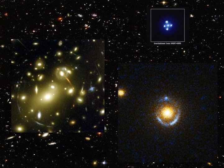 Gravitational Lensing Effect • The Gravitational Lensing effect occurs when light reaching an observer has passed by a very massive body which is heavily distorting space. The light can be seen, (of course), to bend around the body.