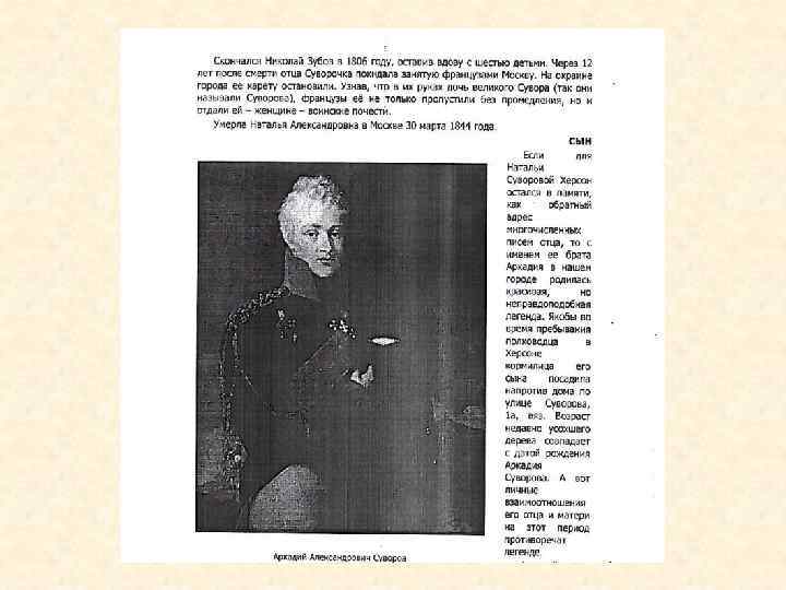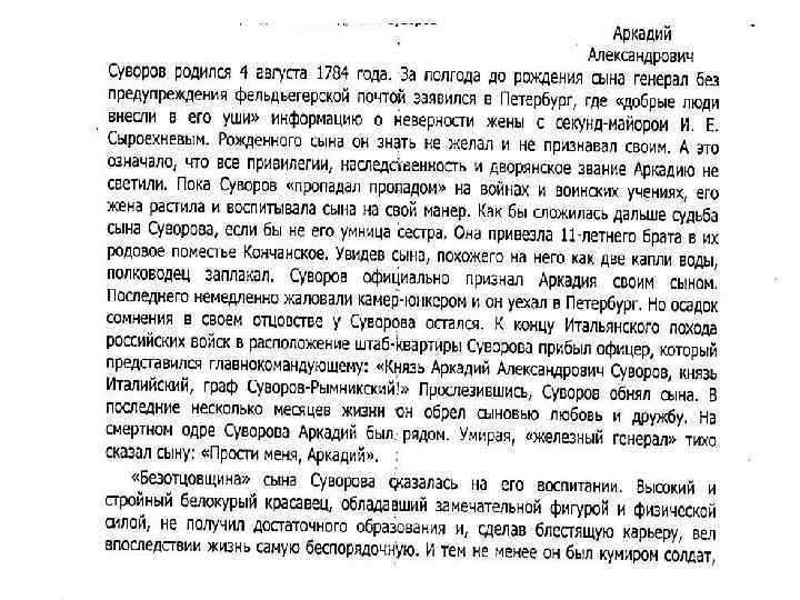 Сын выдающегося полководца Александра Васильевича Суворова Аркадий родился в 1784 г. До 11 лет он жил у матери, а затем был назначен камерюнкером к великому князю Константину Павловичу. Когда началась италийская, Павел 1 отправил Аркадия в чине генерал- адъютанта к отцу А. В. Суворову. В боевых походах и схватках пятнадцатилетний мальчик проявил смелость и отвагу. Военные способности и фкомпанияамилия Суворова способствовали успешной военной карьере Аркадия. В 1809 году он уже командовал дивизией. Но во время русско-турецкой войны в 1811 году, переправляясь через реку Рымну, где его отец А. В. Суворов одержал когда-то блестящую победу, и к его фамилий прибавили приставку Рымникский, Аркадий утонул, спасая солдата. Современник А. А. Суворова, принц Виртембергский так охарактеризовал Аркадия: