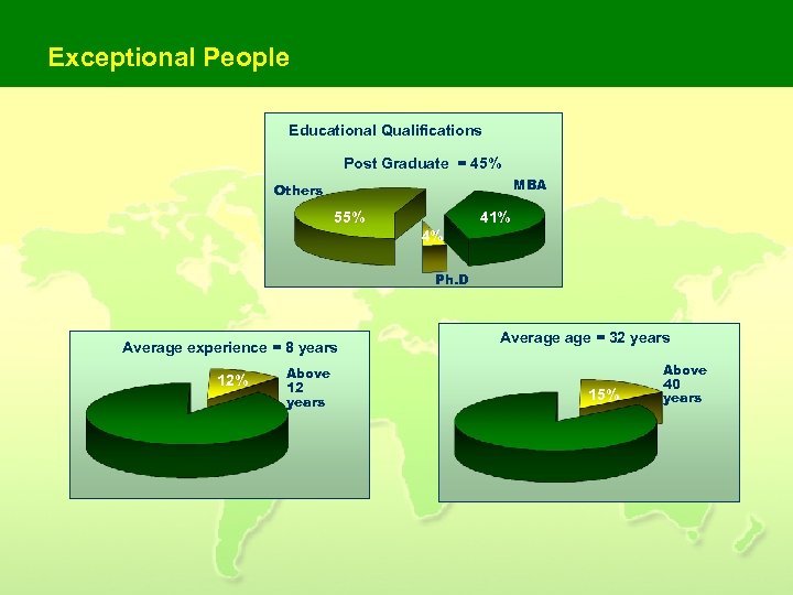 Exceptional People Educational Qualifications Post Graduate = 45% MBA Others 55% 41% 4% Ph. D Average experience = 8 years 12% Above 12 years Average = 32 years 15% Above 40 years