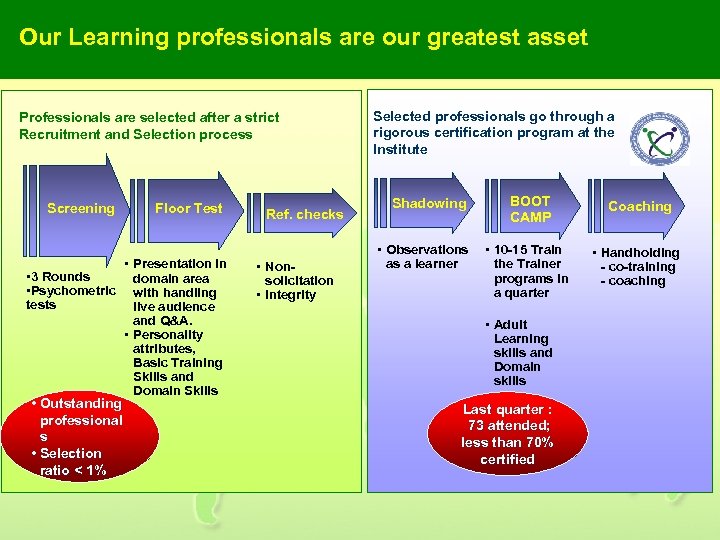 Our Learning professionals are our greatest asset Professionals are selected after a strict Recruitment and Selection process Screening Floor Test • Presentation in • 3 Rounds domain area • Psychometric with handling tests live audience and Q&A. • Personality attributes, Basic Training Skills and Domain Skills • Outstanding professional s • Selection ratio < 1% Ref. checks • Nonsolicitation • Integrity Selected professionals go through a rigorous certification program at the Institute Shadowing • Observations as a learner BOOT CAMP • 10 -15 Train the Trainer programs in a quarter • Adult Learning skills and Domain skills Last quarter : 73 attended; less than 70% certified Coaching • Handholding - co-training - coaching
