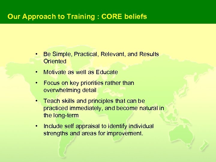 Our Approach to Training : CORE beliefs • Be Simple, Practical, Relevant, and Results Oriented • Motivate as well as Educate • Focus on key priorities rather than overwhelming detail • Teach skills and principles that can be practiced immediately, and become natural in the long-term • Include self appraisal to identify individual strengths and areas for improvement.