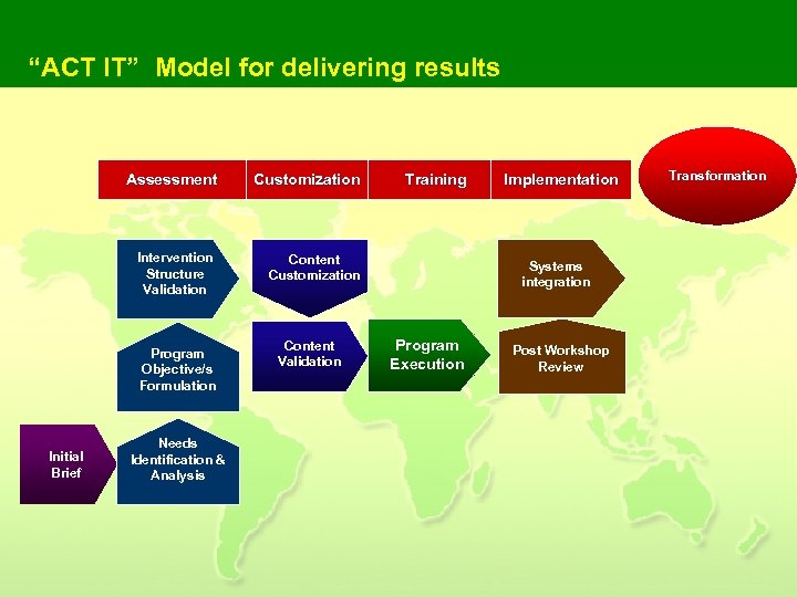 “ACT IT” Model for delivering results Assessment Intervention Structure Validation Program Objective/s Formulation Initial Brief Needs Identification & Analysis Customization Training Content Customization Content Validation Implementation Systems integration Program Execution Post Workshop Review Transformation