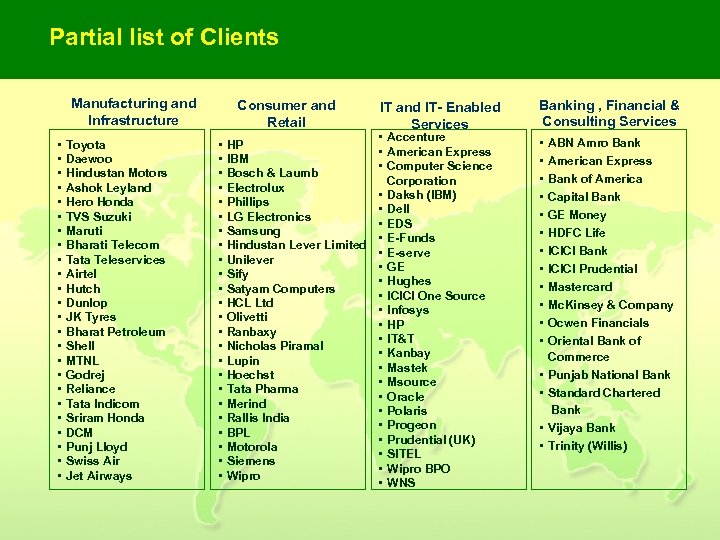 Partial list of Clients Manufacturing and Infrastructure • • • • • • Toyota Daewoo Hindustan Motors Ashok Leyland Hero Honda TVS Suzuki Maruti Bharati Telecom Tata Teleservices Airtel Hutch Dunlop JK Tyres Bharat Petroleum Shell MTNL Godrej Reliance Tata Indicom Sriram Honda DCM Punj Lloyd Swiss Air Jet Airways Consumer and Retail • • • • • • HP IBM Bosch & Laumb Electrolux Phillips LG Electronics Samsung Hindustan Lever Limited Unilever Sify Satyam Computers HCL Ltd Olivetti Ranbaxy Nicholas Piramal Lupin Hoechst Tata Pharma Merind Rallis India BPL Motorola Siemens Wipro IT and IT- Enabled Services • Accenture • American Express • Computer Science Corporation • Daksh (IBM) • Dell • EDS • E-Funds • E-serve • GE • Hughes • ICICI One Source • Infosys • HP • IT&T • Kanbay • Mastek • Msource • Oracle • Polaris • Progeon • Prudential (UK) • SITEL • Wipro BPO • WNS Banking , Financial & Consulting Services • • • ABN Amro Bank American Express Bank of America Capital Bank GE Money HDFC Life ICICI Bank ICICI Prudential Mastercard Mc. Kinsey & Company Ocwen Financials Oriental Bank of Commerce • Punjab National Bank • Standard Chartered Bank • Vijaya Bank • Trinity (Willis)