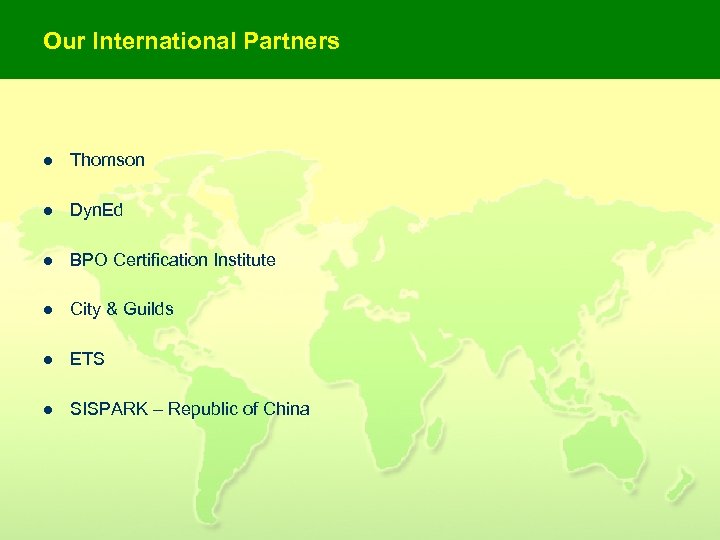 Our International Partners l Thomson l Dyn. Ed l BPO Certification Institute l City & Guilds l ETS l SISPARK – Republic of China