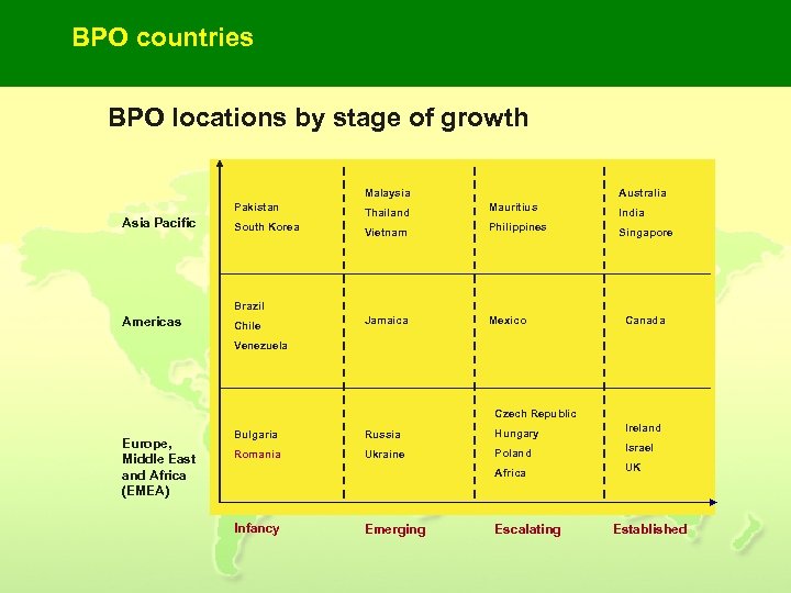 BPO countries BPO locations by stage of growth Malaysia Pakistan Asia Pacific South Korea Thailand Vietnam Australia Mauritius Philippines India Singapore Brazil Americas Chile Jamaica Mexico Canada Venezuela Czech Republic Europe, Middle East and Africa (EMEA) Bulgaria Russia Hungary Romania Ukraine Poland Africa Infancy Emerging Escalating Ireland Israel UK Established