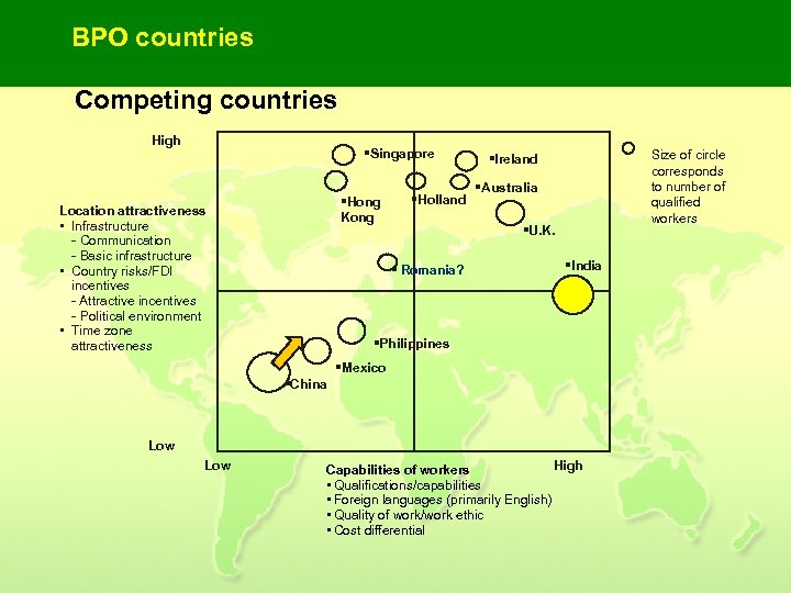 BPO countries Competing countries High §Singapore §Hong Kong Location attractiveness • Infrastructure - Communication - Basic infrastructure • Country risks/FDI incentives - Attractive incentives - Political environment • Time zone attractiveness §Holland Size of circle corresponds to number of qualified workers §Ireland §Australia §U. K. § Romania? §India §Philippines §Mexico §China Low High Capabilities of workers • Qualifications/capabilities • Foreign languages (primarily English) • Quality of work/work ethic • Cost differential