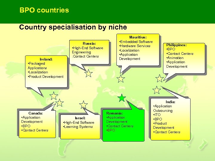 BPO countries Country specialisation by niche Ireland: • Packaged Applications • Localization • Product Development Canada: • Application Development • BPO • Contact Centers Russia: • High-End Software Engineering. Contact Centers Israel: • High-End Software • Learning Systems Mauritius: • Embedded Software • Hardware Services • Localization • Application Development Romania: • Application Development • Contact Centers • BPO Philippines: • BPO • Contact Centers • Animation • Application Development India: • Application Outsourcing • ITO • BPO • Product Development • Contact Centers