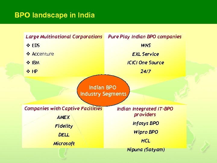BPO landscape in India Large Multinational Corporations Pure Play Indian BPO companies v EDS WNS v Accenture EXL Service v IBM ICICI One Source v HP 24/7 Indian BPO Industry Segments Companies with Captive Facilities AMEX Fidelity DELL Microsoft Indian Integrated IT-BPO providers Infosys BPO Wipro BPO HCL Nipuna (Satyam)