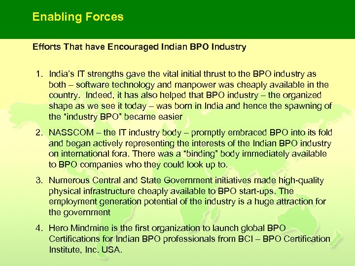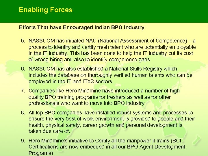 Enabling Forces Efforts That have Encouraged Indian BPO Industry 5. NASSCOM has initiated NAC (National Assessment of Competence) – a process to identify and certify fresh talent who are potentially employable in the IT industry. This has been done to help the IT industry cut its cost of wrong hiring and also to identify competence gaps 6. NASSCOM has also established a National Skills Registry which includes the database on thoroughly verified human talents who can be employed in the IT and ITe. S sectors. 7. Companies like Hero Mindmine have introduced a number of high quality BPO training programs for freshers as well as for other professionals who want to move into BPO industry 8. All top BPO companies have installed robust systems and processes to ensure the very best of work environment is provided to people and their health, physical safety, career growth and personal development is taken due care of. 9. Hero Mindmine’s initiative to Certify all the manpower it trains (BCI Certifications are now embedded in all our BPO Agent Development Programs)