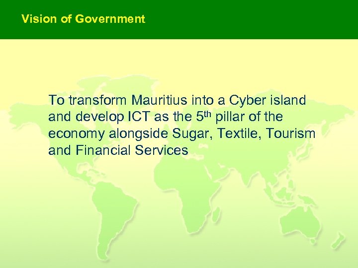 Vision of Government To transform Mauritius into a Cyber island develop ICT as the 5 th pillar of the economy alongside Sugar, Textile, Tourism and Financial Services