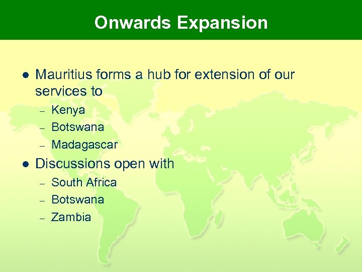 Onwards Expansion l Mauritius forms a hub for extension of our services to – – – l Kenya Botswana Madagascar Discussions open with – – – South Africa Botswana Zambia