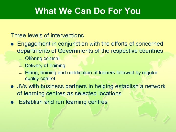 What We Can Do For You Three levels of interventions l Engagement in conjunction with the efforts of concerned departments of Governments of the respective countries – – – l l Offering content Delivery of training Hiring, training and certification of trainers followed by regular quality control JVs with business partners in helping establish a network of learning centres as selected locations Establish and run learning centres