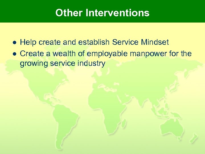 Other Interventions l l Help create and establish Service Mindset Create a wealth of employable manpower for the growing service industry