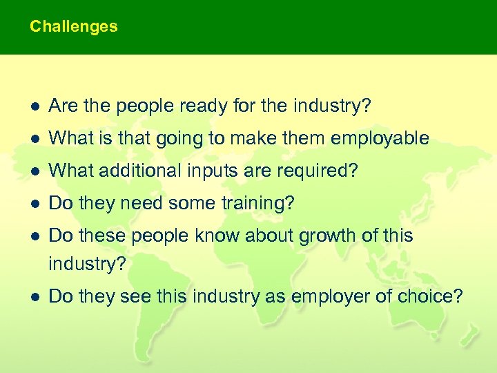 Challenges l Are the people ready for the industry? l What is that going to make them employable l What additional inputs are required? l Do they need some training? l Do these people know about growth of this industry? l Do they see this industry as employer of choice?