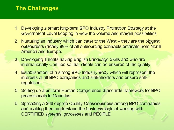 The Challenges 1. Developing a smart long-term BPO Industry Promotion Strategy at the Government Level keeping in view the volume and margin possibilities 2. Nurturing an Industry which can cater to the West – they are the biggest outsourcers (nearly 88% of all outsourcing contracts emanate from North America and Europe. 3. Developing Talents having English Language Skills and who are internationally Certified so that clients can be ensured of the quality 4. Establishment of a strong BPO Industry Body which will represent the interests of all BPO companies and stakeholders and ensure selfregulation 5. Setting up a uniform Human Competence Standards framework for BPO professionals in Mauritius 6. Spreading a 360 degree Quality Consciousness among BPO companies and making them understand the business logic of working with CERTIFIED systems, processes and PEOPLE