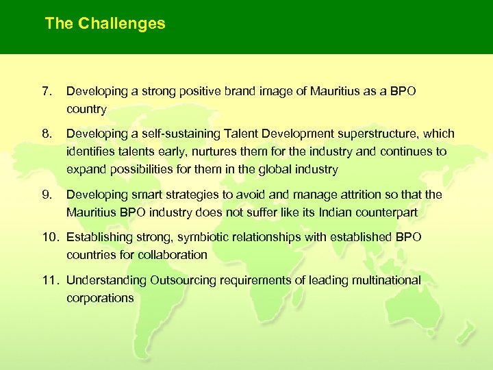 The Challenges 7. Developing a strong positive brand image of Mauritius as a BPO country 8. Developing a self-sustaining Talent Development superstructure, which identifies talents early, nurtures them for the industry and continues to expand possibilities for them in the global industry 9. Developing smart strategies to avoid and manage attrition so that the Mauritius BPO industry does not suffer like its Indian counterpart 10. Establishing strong, symbiotic relationships with established BPO countries for collaboration 11. Understanding Outsourcing requirements of leading multinational corporations