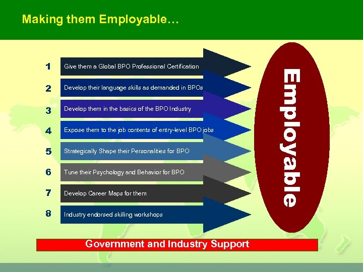 Making them Employable… Give them a Global BPO Professional Certification 2 Develop their language skills as demanded in BPOs 3 Develop them in the basics of the BPO Industry 4 Expose them to the job contents of entry-level BPO jobs 5 Strategically Shape their Personalities for BPO 6 Tune their Psychology and Behavior for BPO 7 Develop Career Maps for them 8 Industry endorsed skilling workshops Government and Industry Support Employable 1