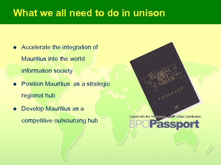 What we all need to do in unison l Accelerate the integration of Mauritius into the world information society l Position Mauritius as a strategic regional hub l Develop Mauritius as a competitive outsourcing hub