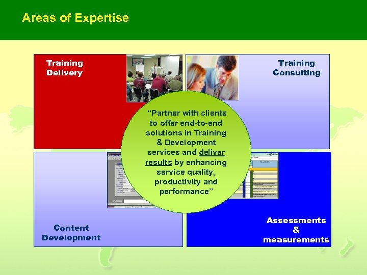 Areas of Expertise Training Delivery Training Consulting “Partner with clients to offer end-to-end solutions in Training & Development services and deliver results by enhancing service quality, productivity and performance” Content Development Assessments & measurements
