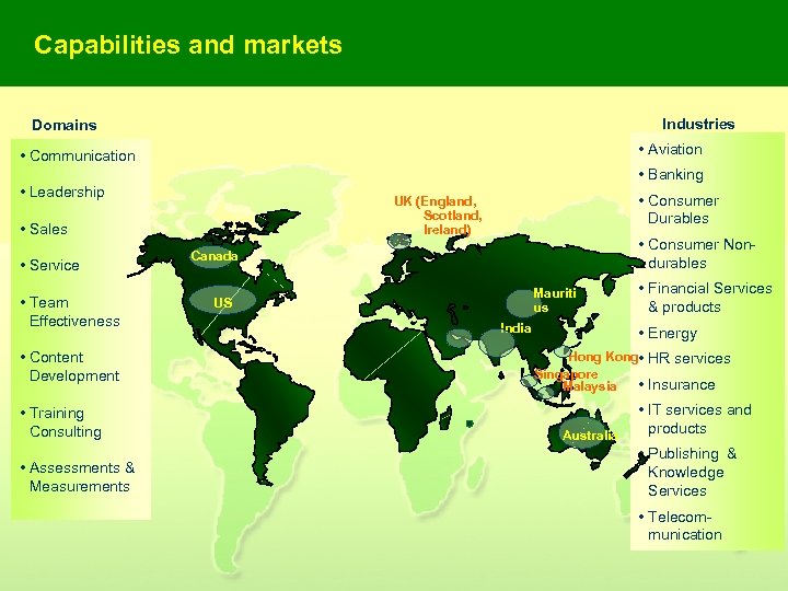 Capabilities and markets Industries Domains • Aviation • Communication • Banking • Leadership • Sales • Service • Team Effectiveness • Content Development • Training Consulting • Assessments & Measurements • Consumer Durables UK (England, Scotland, Ireland) • Consumer Nondurables Canada Mauriti us US India • Financial Services & products • Energy Hong Kong • HR services Singapore • Insurance Malaysia Australia • IT services and products • Publishing & Knowledge Services • Telecommunication