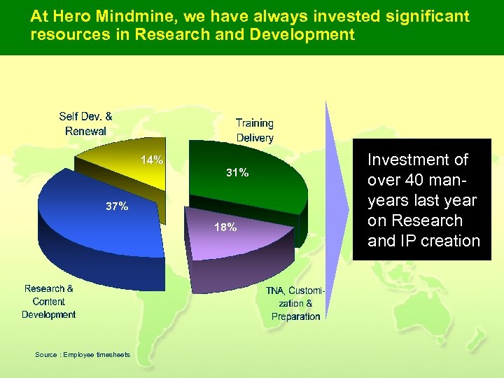 At Hero Mindmine, we have always invested significant resources in Research and Development 14% 31% 37% 18% Source : Employee timesheets Investment of over 40 manyears last year on Research and IP creation