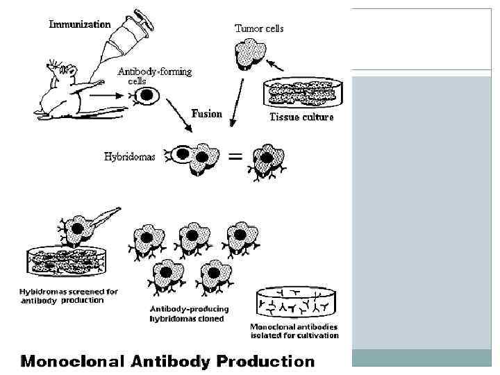 What are monoclonal antibodies? Antibodies are proteins produced by the B lymphocytes of the immune system in response to foreign proteins, called antigens. Antibodies function as markers, binding to the antigen so that the antigen molecules can be recognized and destroyed by phagocytes. The part of the antigen that the antibody binds to is called the epitope. The epitope is thus a short amino acid sequence that the antibody is able to recognize (Campbell NA, 1996). Two features of the antibody-epitope relationship are key to the use of monoclonal antibodies as a molecular tool. specificity -- the antibody binds only to its particular epitope sufficiency -- the epitope can bind to the antibody on its own, i. e. the presence of the whole antigen molecule is not necessary Structurally antibodies are proteins consisting of four polypeptide chains. These four chains form a quaternary structure somewhat resembling a Y shape. Figure 1 shows the three dimensional structure of immunoglobulin G, a typical antibody, and its schematic representation. Each B cell in an organism synthesizes only one kind of antibody. In an organism, there is an entire population of different types of B cells and their respective antibodies that were produced in response to the various antigens that the organism had been exposed to. However to be useful as a tool, molecular biologists need substantial amounts of a single antibody (and that antibody alone). Therefore we need a method to culture a population of B cells derived from a single ancestral B cell, so that this population of B cells would allow us to harvest a single kind of antibody. This population of cells would be correctly described as monoclonal, and the antibodies produced by this population of B cells are called monoclonal antibodies. In contrast, antibodies obtained from the blood of an immunized animal are called polyclonal antibodies.