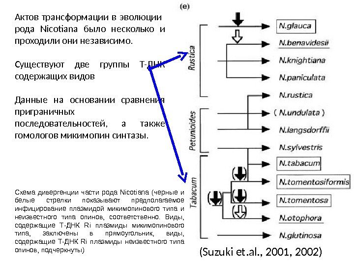 35 ( Suzuki et. al. , 2001, 2002)Актов трансформации в эволюции рода Nicotiana было несколько и проходили они независимо. Существуют две группы Т-ДНК содержащих видов Данные на основании сравнения приграничных последовательностей, а также гомологов микимопин синтазы. Схема дивергенции части рода Nicotiana (черные и белые стрелки показывают предполагаемое инфицирование плазмидой микимопинового типа и неизвестного типа опинов, соответственно. Виды, содержащие Т-ДНК Ri плазмиды микимопинового типа, заключены в прямоугольник, виды, содержащие Т-ДНК Ri плазмиды неизвестного типа опинов, подчеркнуты)