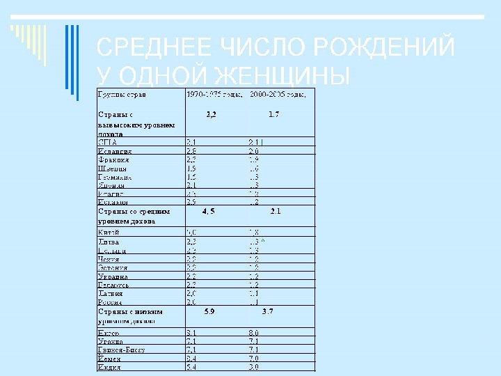 Коэффициенты жизнеспособности народов. № Балл Страна 1. 1, 1 – 1, 3. 2. 1. 4 Россия 3. 1, 5 Западная Сахара, Босния, Афганистан. 4. 1, 6 Сомали, Гаити, Бирма, Папуа-Новая Гвинея; 5. 1, 7 - 1, 9 6. 2 7. 3 8. 4 Украина, Казахстан, другие страны Средней Азии, Молдавия, Беларусь, коренное население ЮАР, аборигены Австралии, индейцы Ю. и Центр. Америки, а также страны Центральной и Восточной Африки. Китай, КНДР, Ирак, Бразилия, Аргентина, Монголия, Албания, Турция, государства Восточной Европы, Куба, Вьетнам, страны Балтии, Туркмения США, Япония, Германия и др. развитые страны, Тайвань, Ю. Корея, Сингапур, Малайзия, Израиль, Коста-Рика, Югославия (до войны). Швеция, Нидерланды, Бельгия, Дания, Исландия 9. 5 Согласно исследованиям ВОЗ 5 баллов не имеет ни одна Буркина-Фасо, Чад, Эфиопия, Судан,