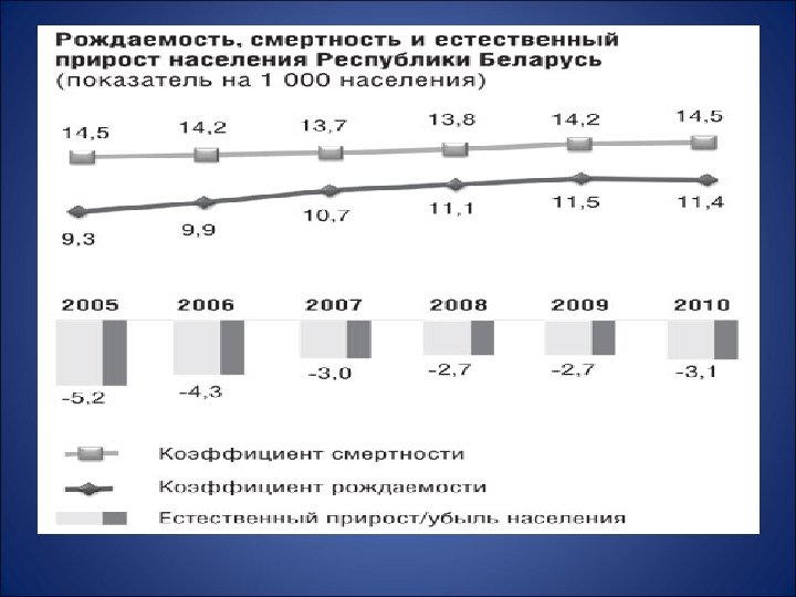 1. Низкой значимостью ценностей семьи, 2. Низким уровнем духовно-нравственного состояния нации, 3. Огромным количеством абортов – массовое, ни с чем не сравнимое убийство детей, развращающее человека как личность и порождающее рост патологических процессов, негативно влияющих на психическое и репродуктивное здоровье. • 4. Отсутствие противодействие агрессивным международным программам ( «Золотой миллиард» , «Планирование семьи» и другим) негативно влияющим на численность населения Республики Беларусь и славянского этноса в целом. • •