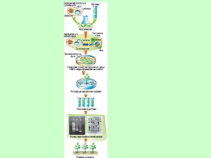 Этапы генетической трансформации • Создание генетической конструкции • Введение ее в клетки растений • Отбор трансформированных клеток (растений) • Доказательство присутствия введенного гена в геноме растения • Анализ экспрессии введенного гена • Анализ наследования трансгена
