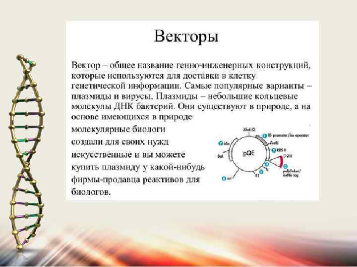 Свойства вектора необходимо подгонять к особенностям клетки, в которую введена рекомбинантная молекула ДНК. Вектор содержит генетические маркеры, по которым ведут селекцию генетически модифицированных клеток. Особый интерес представляют собой плазмиды, обеспечивающие экспрессию включенных в них генов.