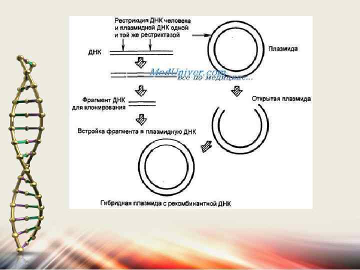 Процесс переноса генов включает пять основных этапов: 1. Получение фрагментов ДНК (генов). 2. Создание рекомбинантной генетической конструкции. 3. Введение ДНК в клетку –хозяина. 4. Идентификация и отбор клеток, несущих рекомбинантную ДНК. 5. Анализ экспрессии перенесённого гена в ДНК-клетку хозяина.