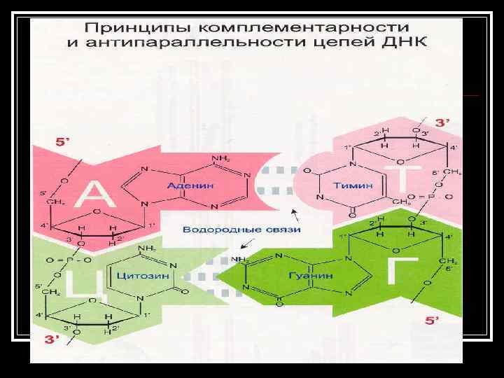 Образование двухцепочечной ДНК происходит по принципу комплементарности n n Комплементарность – последовательность нуклеотидов в одной цепи автоматически определяет строго соответствующую ей последовательность нуклеотидов в комплементарной ей цепи. Так азотистое основание Аденин (А) всегда взаимодействует только с комплементарным ему азотистым основанием Тимин (Т) в молекулах ДНК Комплементарность оснований обеспечивается системой водородных связей.